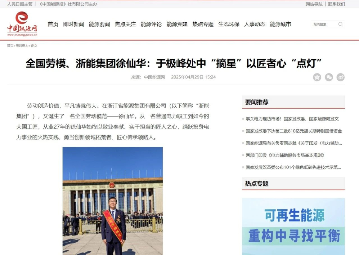 4月29日,人民日報旗下中國能源網報道《全國勞模、浙能集團徐仙華:于極峰中“摘星” 以匠者心點燈》 中國能源網 攝