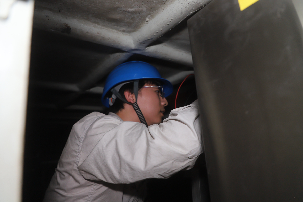 浙能溫電7號機定子溫度測點深藏于維修孔內(nèi)。身材高大的周超泉深吸一口氣,側身、蜷縮,將自己“塞”進了那個狹窄的維修孔。空間逼仄無法轉身,汗水瞬間浸透工裝,肩胛輪廓在濕布下清晰凸顯。他右手持扳手在方寸間精準施力,左手打光照明,將原有的溫度測點切換到了備用溫度測點。當信號恢復平穩(wěn),他脫出“卡位”,長舒一口氣,這才感覺到整個后背的衣衫早已被汗水完全浸透,濕漉漉地緊貼在身上,勾勒出他專注工作后疲憊卻滿足的身影,正是他為保障機組“神經(jīng)末梢”敏銳暢通所付出的證明。