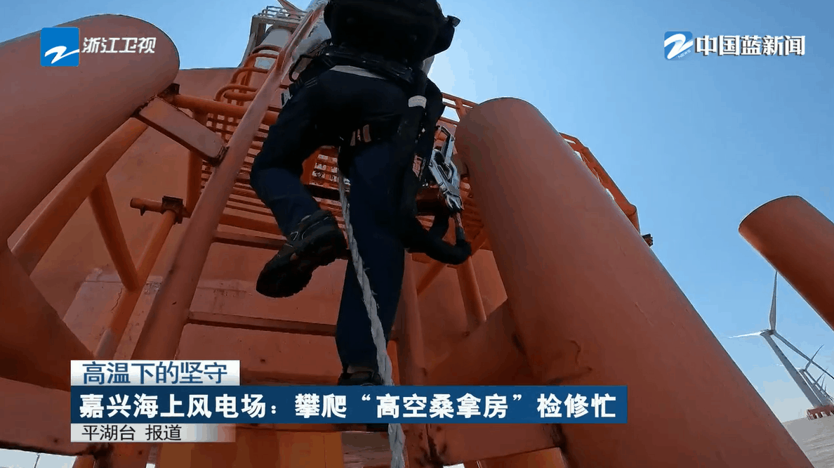 浙江衛(wèi)視《浙江新聞聯(lián)播》報(bào)道浙能嘉興1號海上風(fēng)場攀爬“高空桑拿房”檢修忙。 周晨 提供