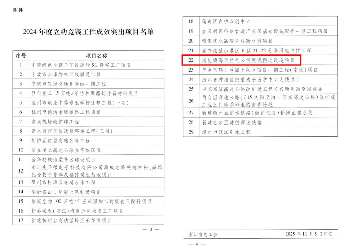 本網訊  近日,浙江省發改委、浙江省總工會聯合公布《2024年度立功競賽工作成效突出項目》名單,全省僅29個項目獲此殊榮,其中,浙能鎮海天然氣公司燃機搬遷改造項目在眾多參評項目中脫穎而出,成功摘得該項榮譽。